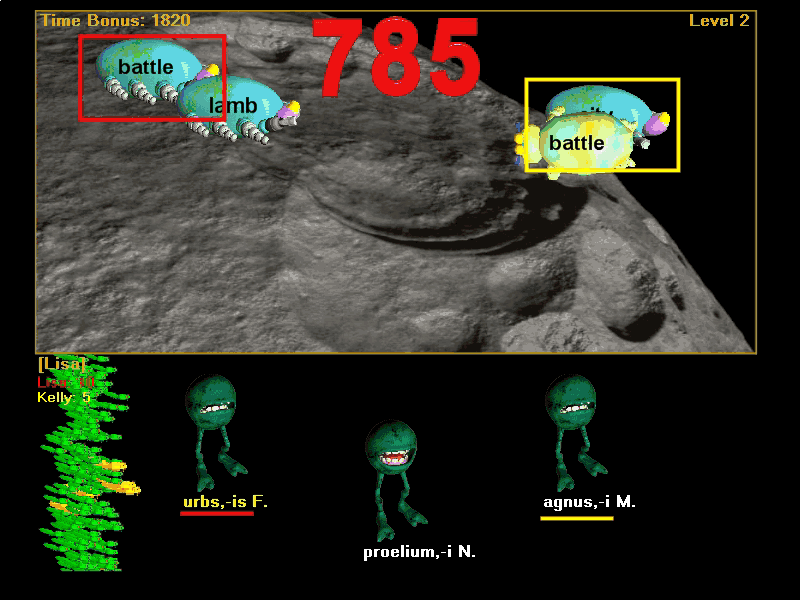 Frog Selection: As described in the screen capture, in the two player game two players play simultaneously using the keyboard. Player One uses the '1', '2', and '3' keys to control his or her 'frog cursor' which is the colored bar under the frog. Player Two uses the '7', '8', and '9' keys to control his frog cursor. Both players can be on the same frog at the same time, and both players can simultaneously eat with the same frog or different frogs. Only ONE frog can eat any bug at any time however, so when a bug is selected for both players only one player will be able to eat it.