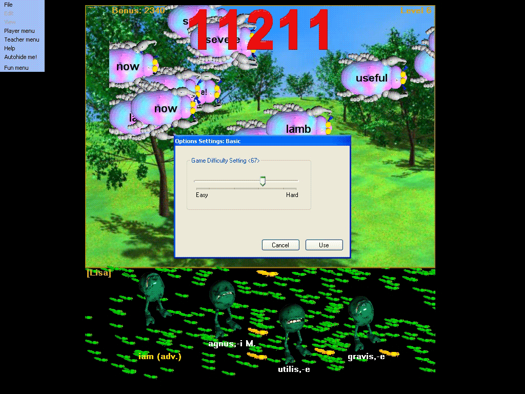 The Player menu item 'Basic Options' in the Hungryfrog Spanish software program allows for quick and easy changes to game difficulty settings with a one-click approach to changing settings.